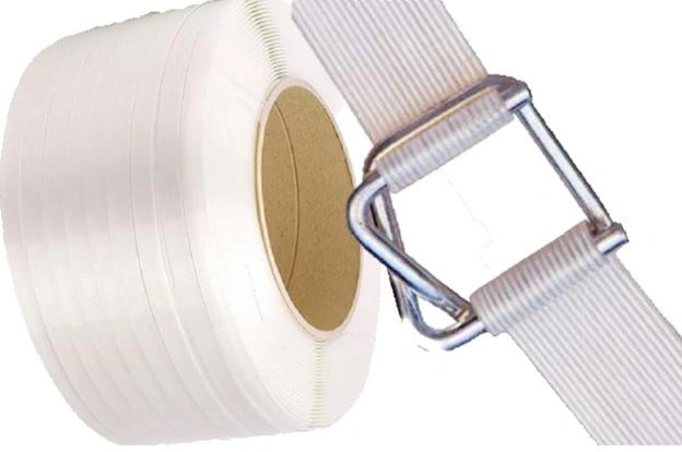 Made from polyester fibers coated with clear polypropylene. The clear polypropylene coating provides added water resistance protection and improved handling properties when threading the strapping under pallets and through metal buckles.